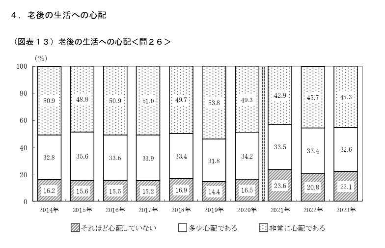 「家計の金融行動に関する世論調査2023年」 (単身世帯調査)によると、「老後の生活が心配」と回答した人は約78%にも上ります。