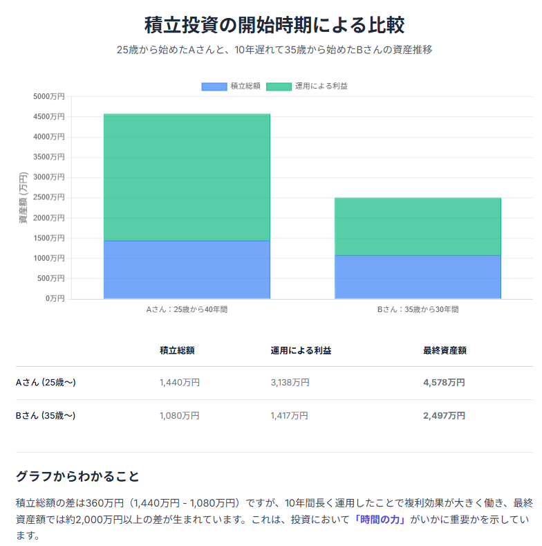 25歳から月々3万円を積み立てるだけで、運用益だけで3,000万円以上が生まれる可能性がある。これは、20代のあなたが行動することで初めて手に入る、未来のあなたへの最高のプレゼントです。