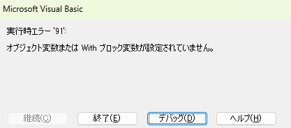 【第5位】実行時エラー ’91’: オブジェクト変数が設定されていません