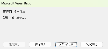 【第4位】実行時エラー ’13’: 型が一致しません