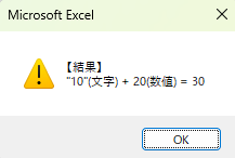 """10""(文字) + 20(数値) = " & (strA + numB), vbExclamation