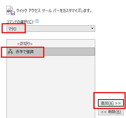 - 登録したいマクロ(ここでは赤字で強調)を選んで、真ん中の「追加」ボタンをクリック!