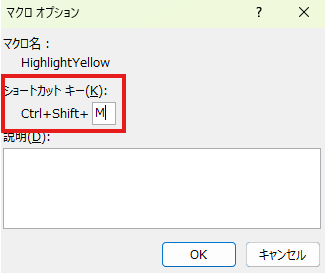 「ショートカットキー」という入力欄に、お好みのアルファベットを1文字入力してください。 例えば m と入力すれば、今後は Ctrl + m を押すだけでそのマクロが即座に実行されるようになります。